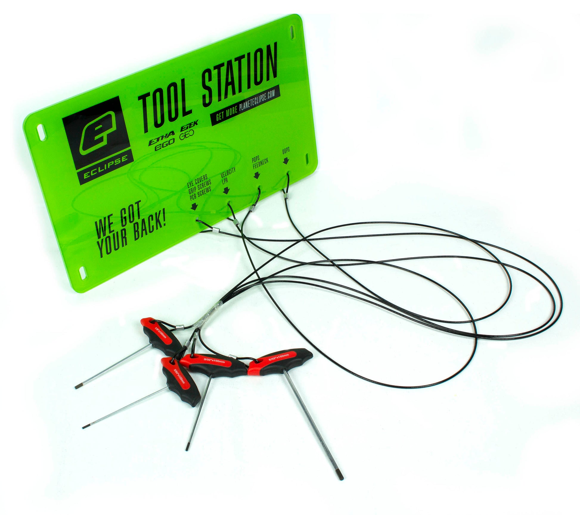 The handy Eclipse Tool Station is perfect for recreational paintball sites and tournament facilities. Simply fix the mountable board near your chrono or teching areas so your customers can adjust their Eclipse Marker using the conveniently attached tools. We got your back!